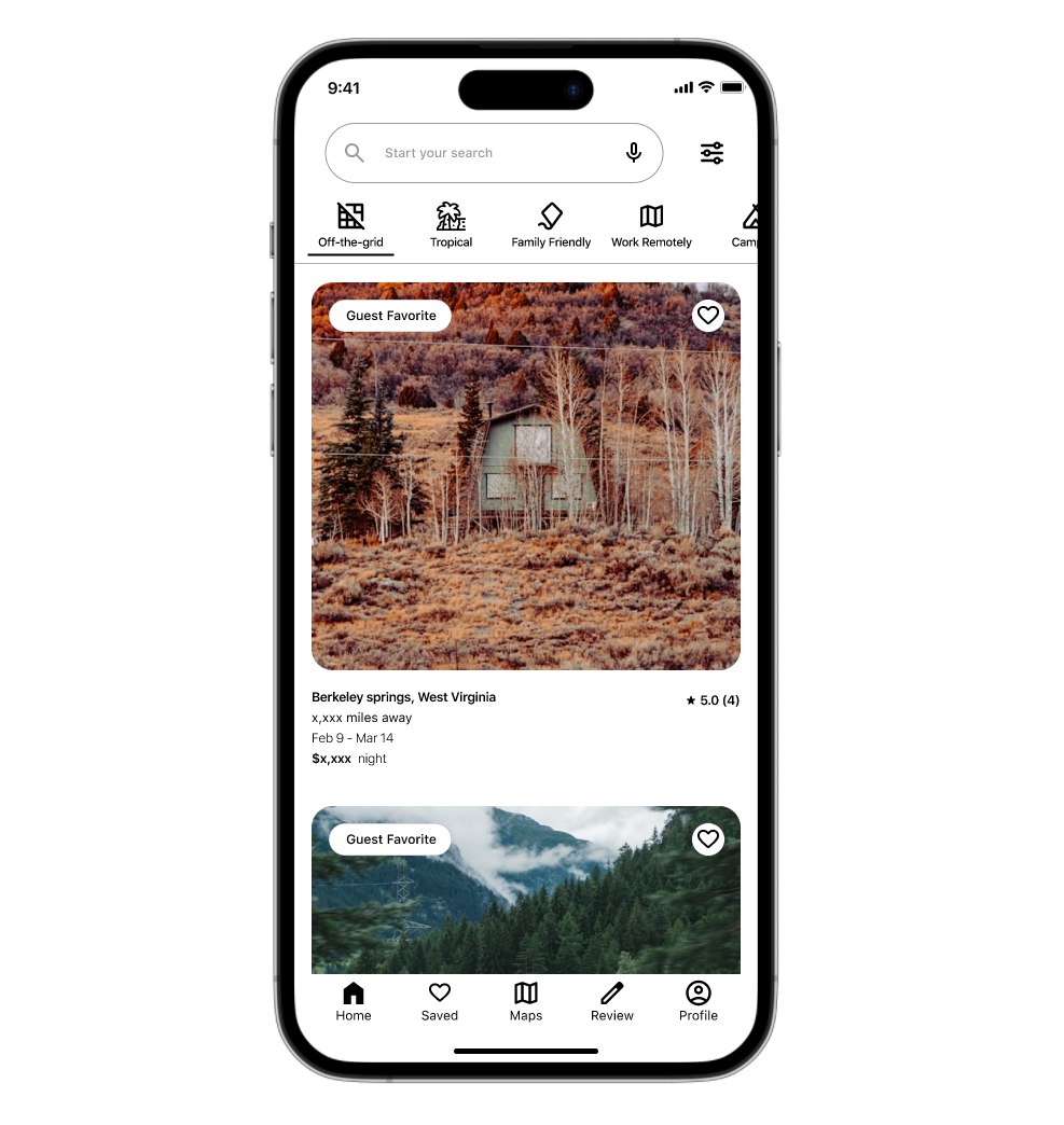 Core tasks: find remote stays, view map, read reviews, locate family-friendly options.