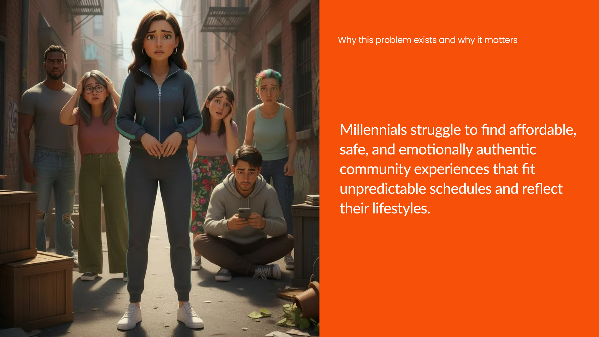 Millennials want real-world connection but avoid social platforms due to cost, unpredictability, social anxiety, and lack of continuity. Existing tools optimize for event discovery, not sustained belonging.